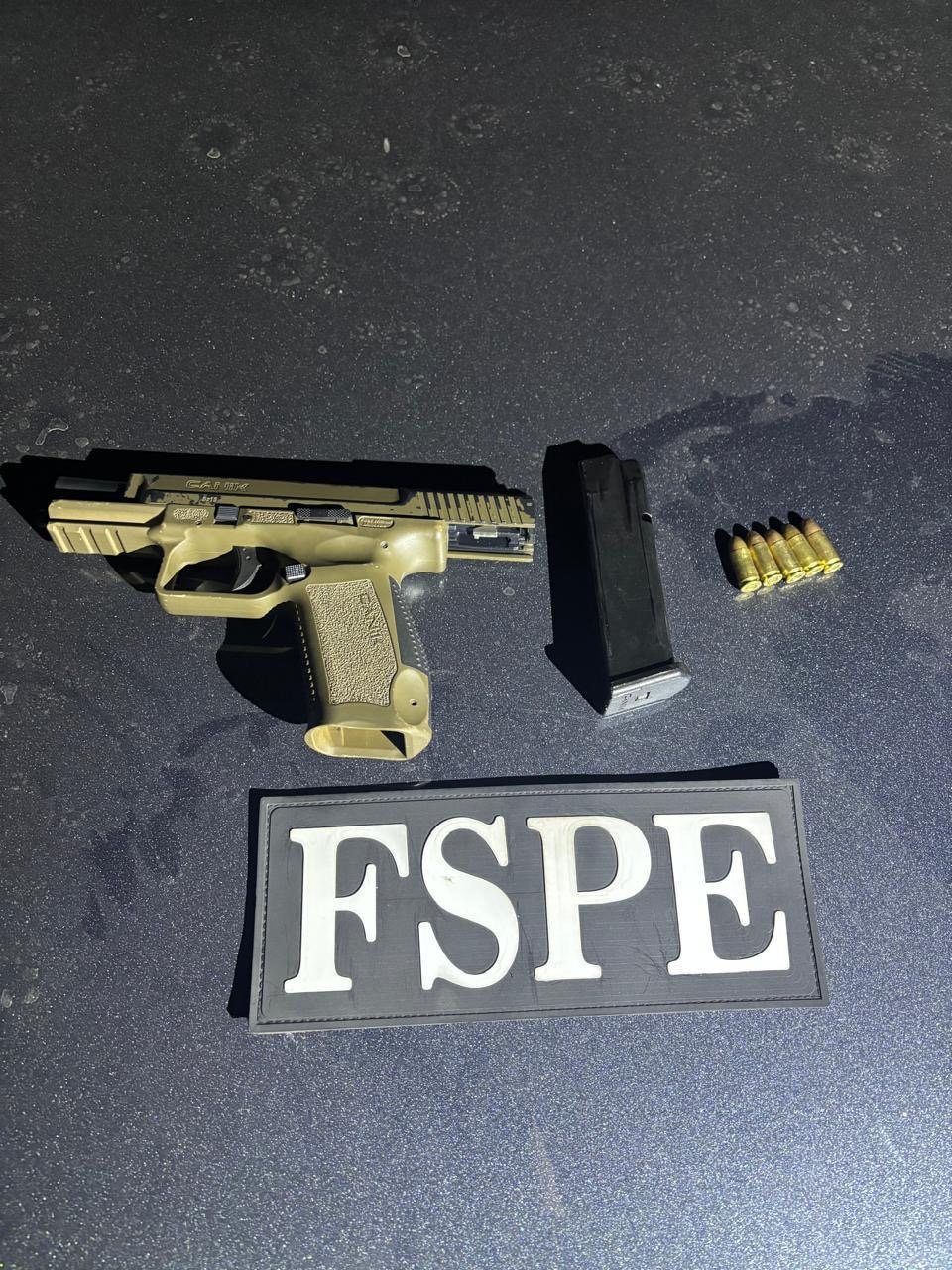 Julio N, de 28 años de edad, y Fernando N, de 24 años de edad, circulaban en un automóvil Kia, color gris Oxford, con reporte de robo; portaban un arma de fuego tipo escuadra, un cargador metálico y 5 cartuchos útiles calibre 9mm.