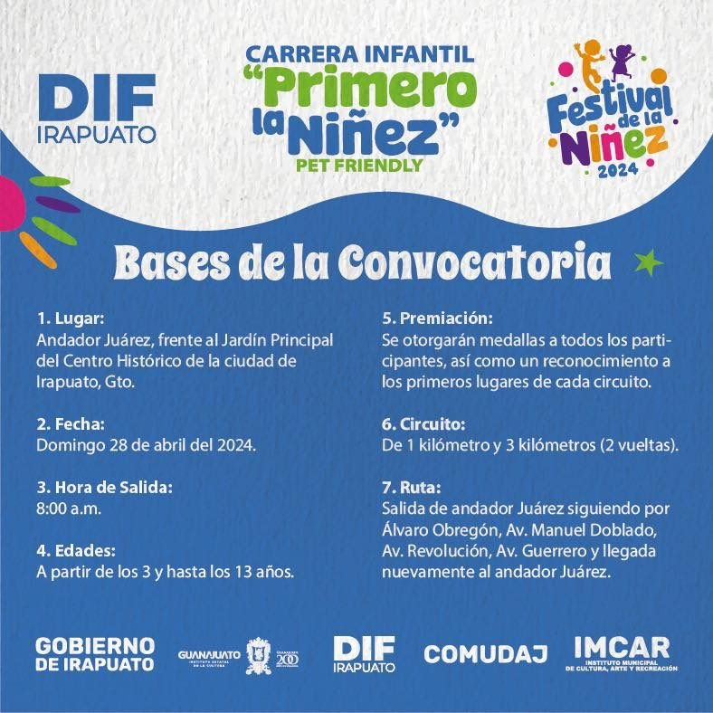 Irapuato, Guanajuato. 22 de abril del 2024.- El Sistema DIF Irapuato, en colaboración con diferentes dependencias municipales invita a niñas, niños y adolescentes a participar en la carrera infantil “Primero la Niñez” Pet Friendly.