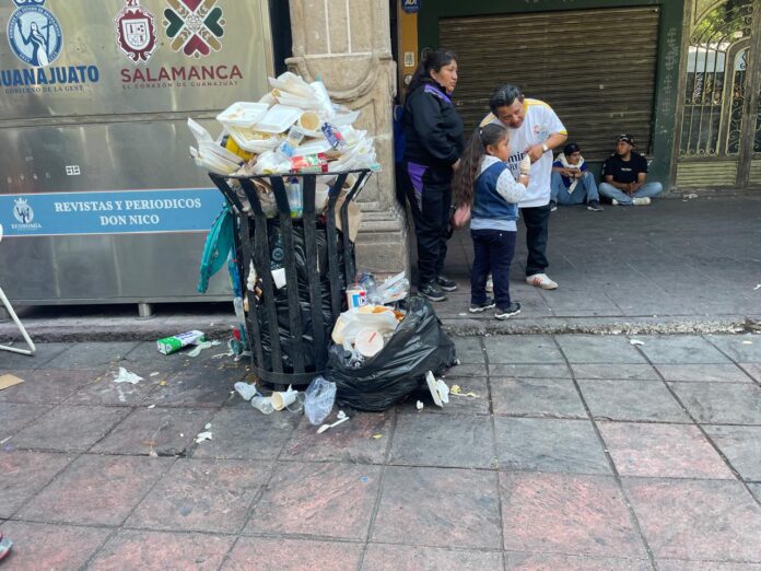 Una muestra de la enorme cantidad de basura generada por salmantinos y visitantes se observó con contenedores desbordando desechos y olores insoportables por el agua negra que fluye en la red de drenaje de la calle Juárez esquina con Tomasa Esteves.