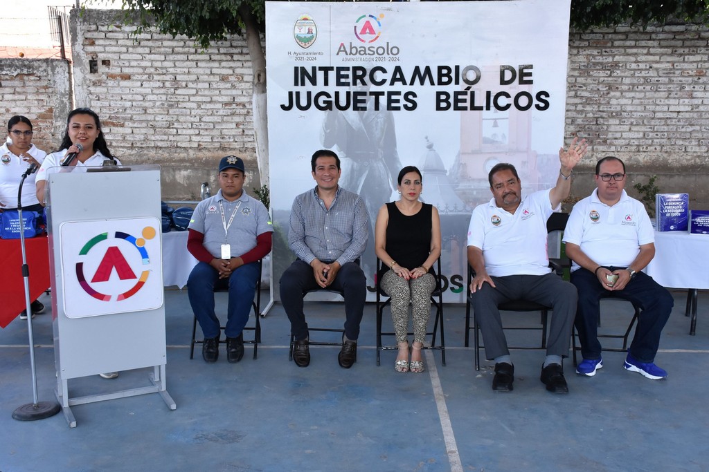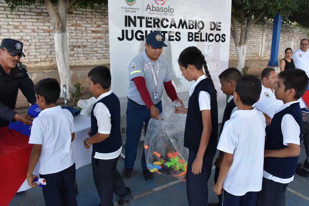 Abasolo, Gto. 28 de junio de 2023.- En la Escuela Primaria Revolución, ubicada en la Cabecera Municipal de Abasolo, se llevó a cabo un intercambio de juguetes bélicos, a cargo del Departamento de Prevención Social de la Violencia y la Delincuencia de la Dirección de Seguridad Pública Municipal.