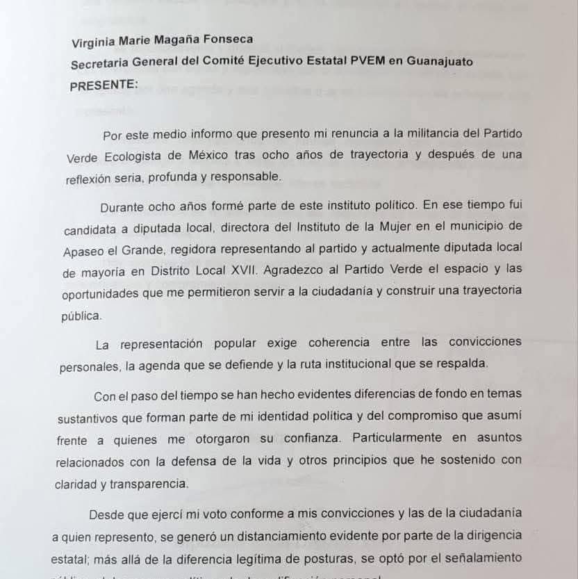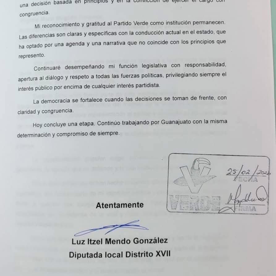 El escenario político en el Congreso del Estado de Guanajuato registró un movimiento relevante tras la renuncia de la diputada local Luz Itzel Mendo González al Grupo Parlamentario del Partido Verde Ecologista de México (PVEM).