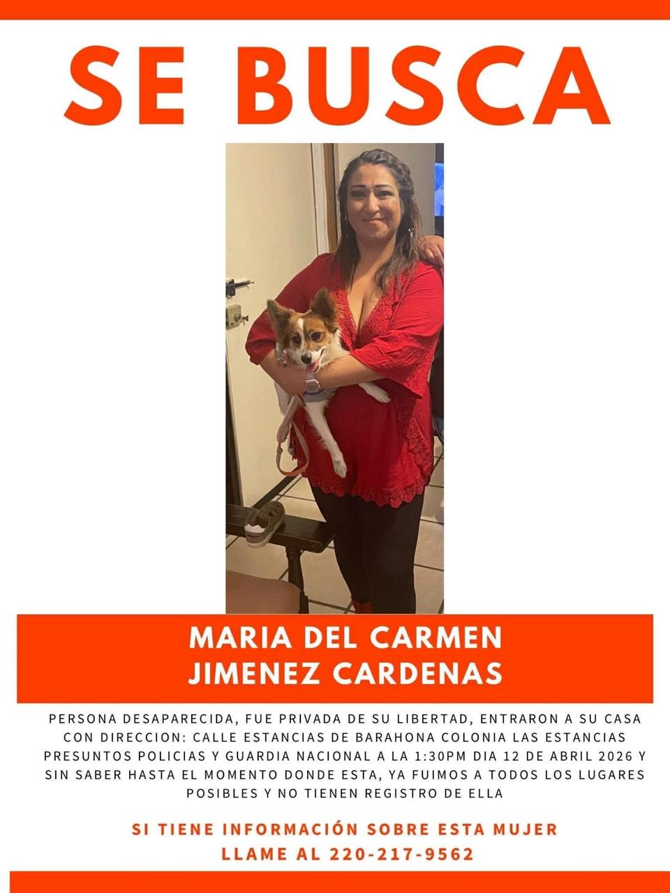 Para el caso de lo que podría representar una desaparición forzada, (no desaparición), en redes sociales fue publicado el caso de María del Carmen Jiménez Cárdenas de la que los reportantes dijeron que “Entraron a su casa supuestos policías y de la Guardia Nacional y se la llevaron hoy a la 1:30 pm y no la encontramos, ya la buscaron en todos los lugares posibles y no tienen registro de ella”.