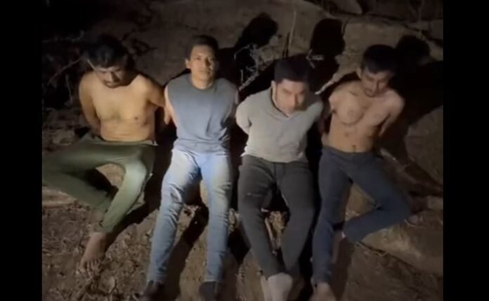 El material audiovisual muestra a los jóvenes sentados sobre la tierra, y atados de sus manos por la espalda.