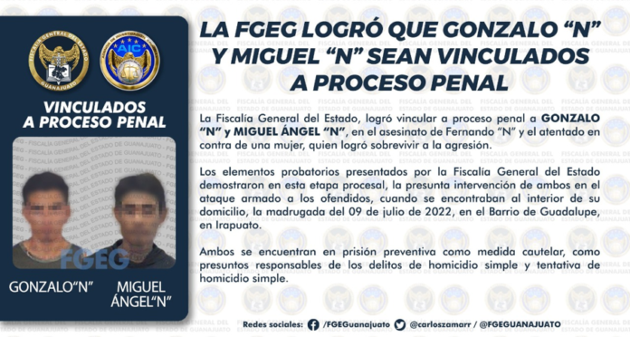La Fiscalía General del Estado, logró vincular a proceso penal a GONZALO «N» y MIGUEL ÁNGEL «N», en el asesinato de Fernando «N» y el atentado en contra de una mujer, quien logró sobrevivir a la agresión.