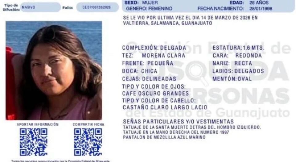 La Fiscalía informó que, el 18 de marzo de 2026, en un sitio de hallazgo en Salamanca identificado gracias a trabajos de investigación del Ministerio Público, se localizó el cuerpo sin vida de Cecilia “N”, integrante de un colectivo en la localidad.
