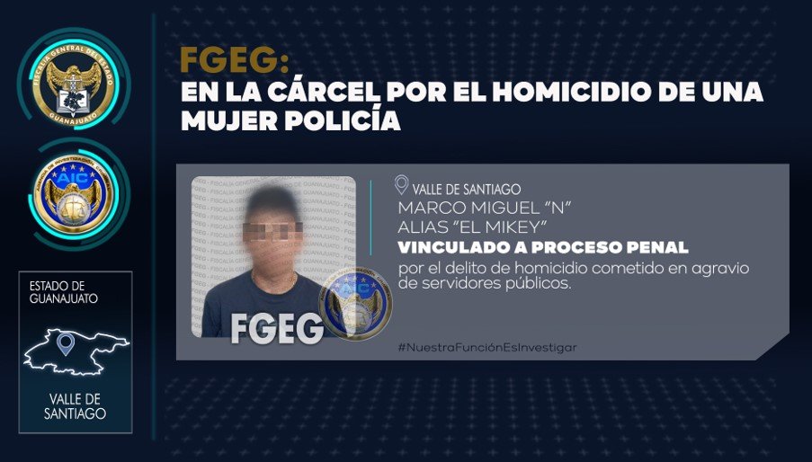 Valle de Santiago, Gto. 2 de octubre de 2022.- El Ministerio Púbico acreditó la participación de MARCO MIGUEL «N», alias «El Mikey», en el asesinato a balazos, de una mujer policía, ocurrido la tarde del pasado domingo en este municipio.