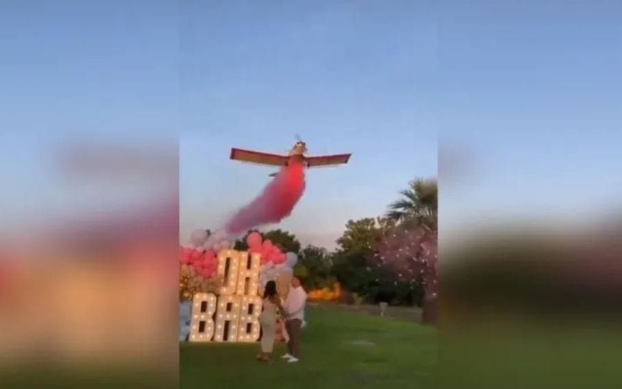 El clip muestra a una pareja muy contenta, quienes se toman de la mano y detrás sale la avioneta en cuestión, misma que arroja polvo de color rosa y comienza a intentar dar unas maniobras, pero pierde el control por una aparente falla y se estrella.