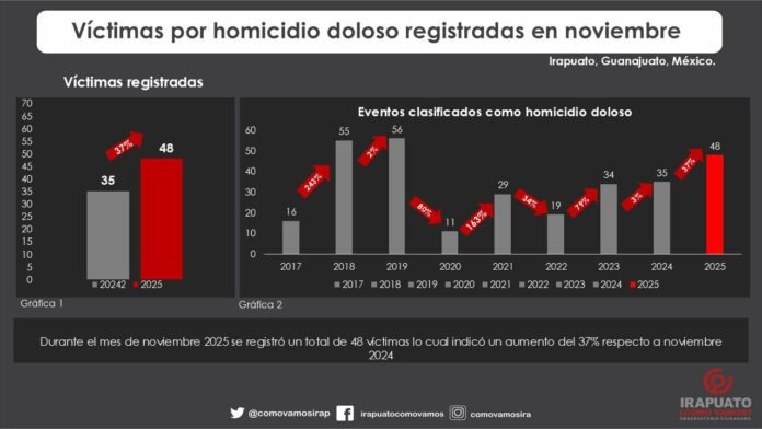 El Observatorio Ciudadano Irapuato ¿Cómo Vamos? reportó un incremento significativo en la violencia letal durante noviembre de 2025. Según su informe mensual, los homicidios dolosos aumentaron 40% respecto al mismo mes del año anterior, mientras que el número de víctimas creció 37%.
