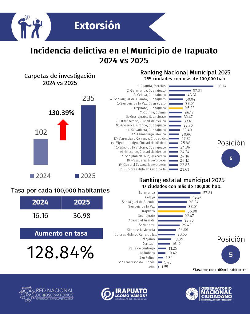 La extorsión mostró uno de los incrementos más significativos, con 235 carpetas en 2025 frente a 102 en 2024, un alza del 130%. Irapuato se ubicó en el sexto lugar nacional y quinto estatal.