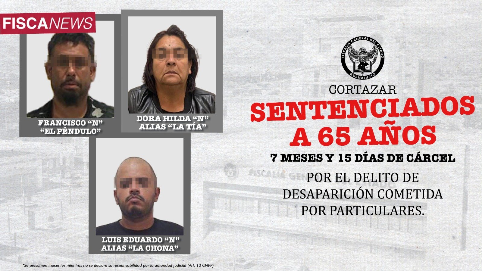 Cortazar, Gto.- 18 de julio de 2023.- En audiencia de individualización de sanciones, una mujer y dos hombres han sido sentenciados a 65 años con 7 meses y 15 días de cárcel, al ser encontrados culpables del delito de desaparición cometida por particulares en agravio de Fernando “N”.