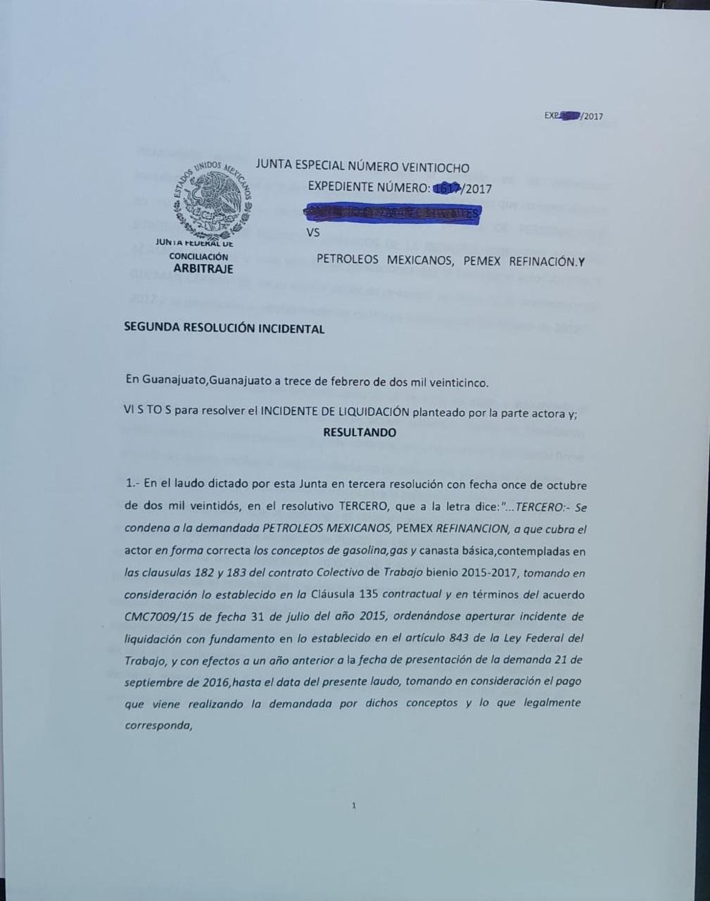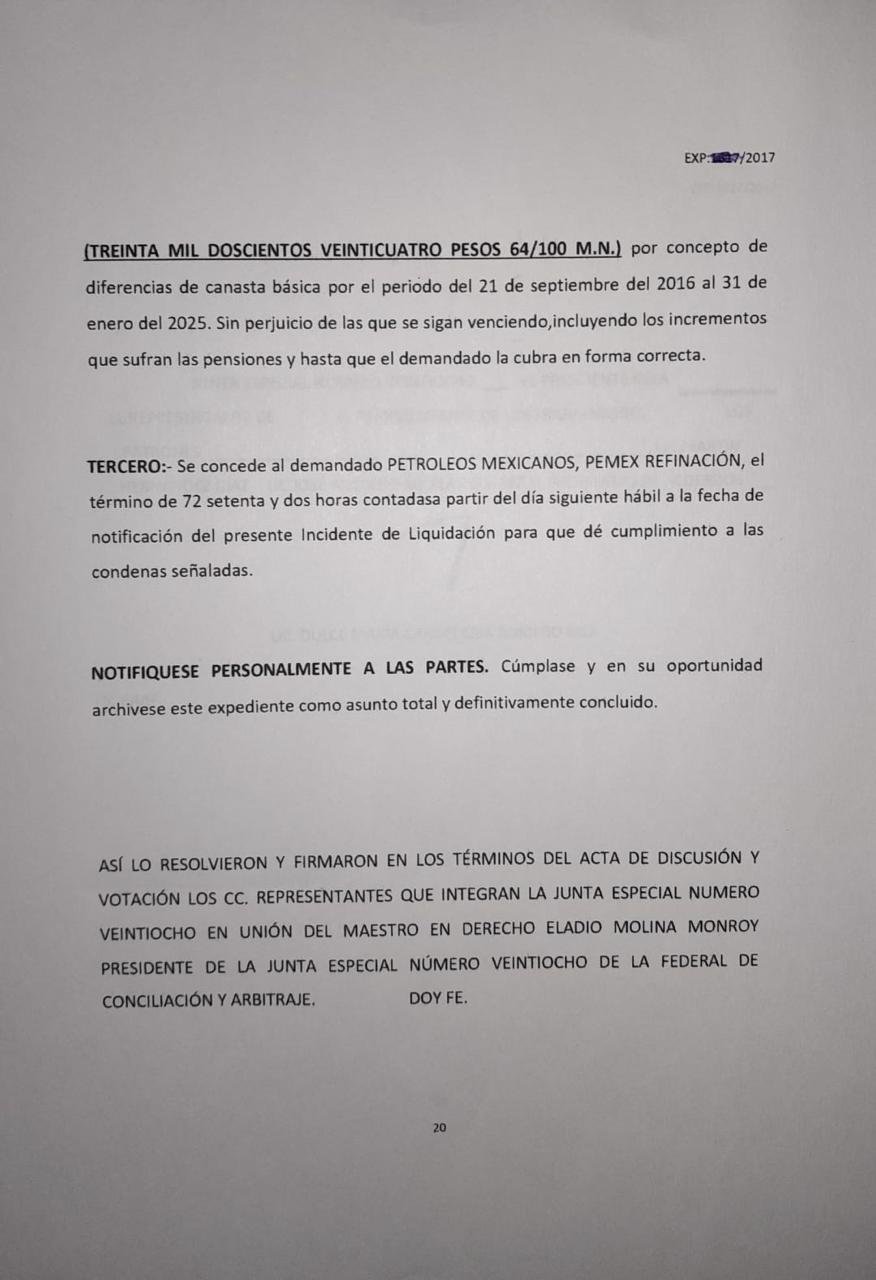 Para comprobar sus dichos, los sindicalistas jubilados y activos otorgaron copia del laudo con la debida protección de datos del trabajador que obtendrá la devolución del dinero que no le fue pagado por prestaciones establecidas en el contrato colectivo del trabajo.
