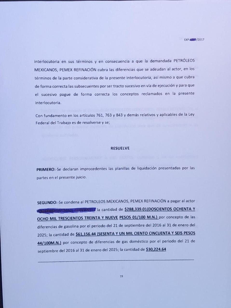 Los dichos se basan a la resolución en la que demuestran los pagos incorrectos “ El compañero que demandó desde 2017 por las diferencias del pago de esas prestaciones gas, gasolina y canasta básica recibirá por fin el pago de casi 380,000.00 pesos. Y eso ya aplicando el acuerdo leonino donde nos afectaron. Curiosamente se sigue apoyando al que nos traicionaron una y otra vez”.