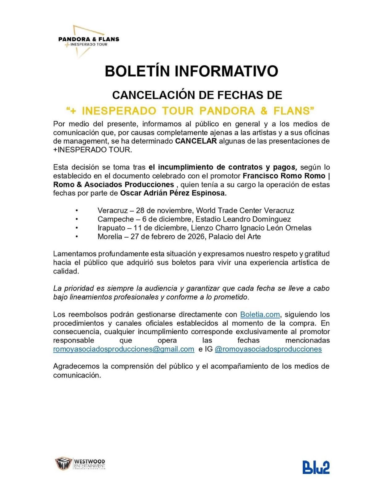 La presentación de los grupos Pandora y Flans en Irapuato fue oficialmente cancelada debido al incumplimiento de contrato y falta de pago por parte de la empresa promotora Romo & Asociados Producciones, según el mismo comunicado oficial.
