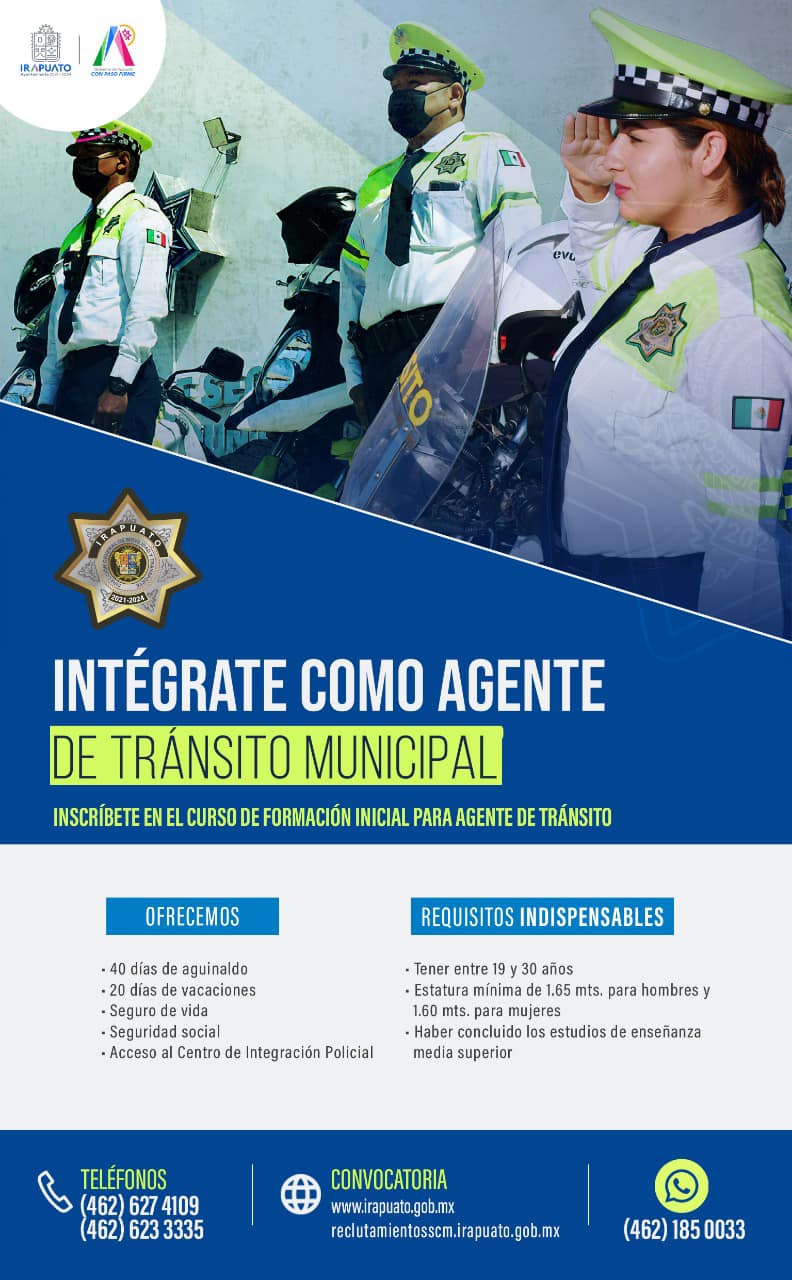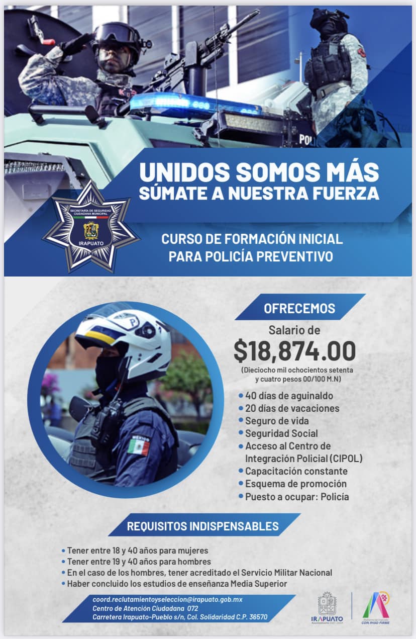 Mayor información al marcar al Centro de Atención Ciudadana 072, a los teléfonos 462 6 22 0329, y 462 6 27 41 09, así como al ingresar a la página www.reclutamientossscm.irapuato.gob.mx o acudir a las instalaciones de la Academia de Seguridad Pública Municipal, ubicadas en colonia Solidaridad s/n, salida a Pueblo Nuevo, colonia Solidaridad Infonavit.