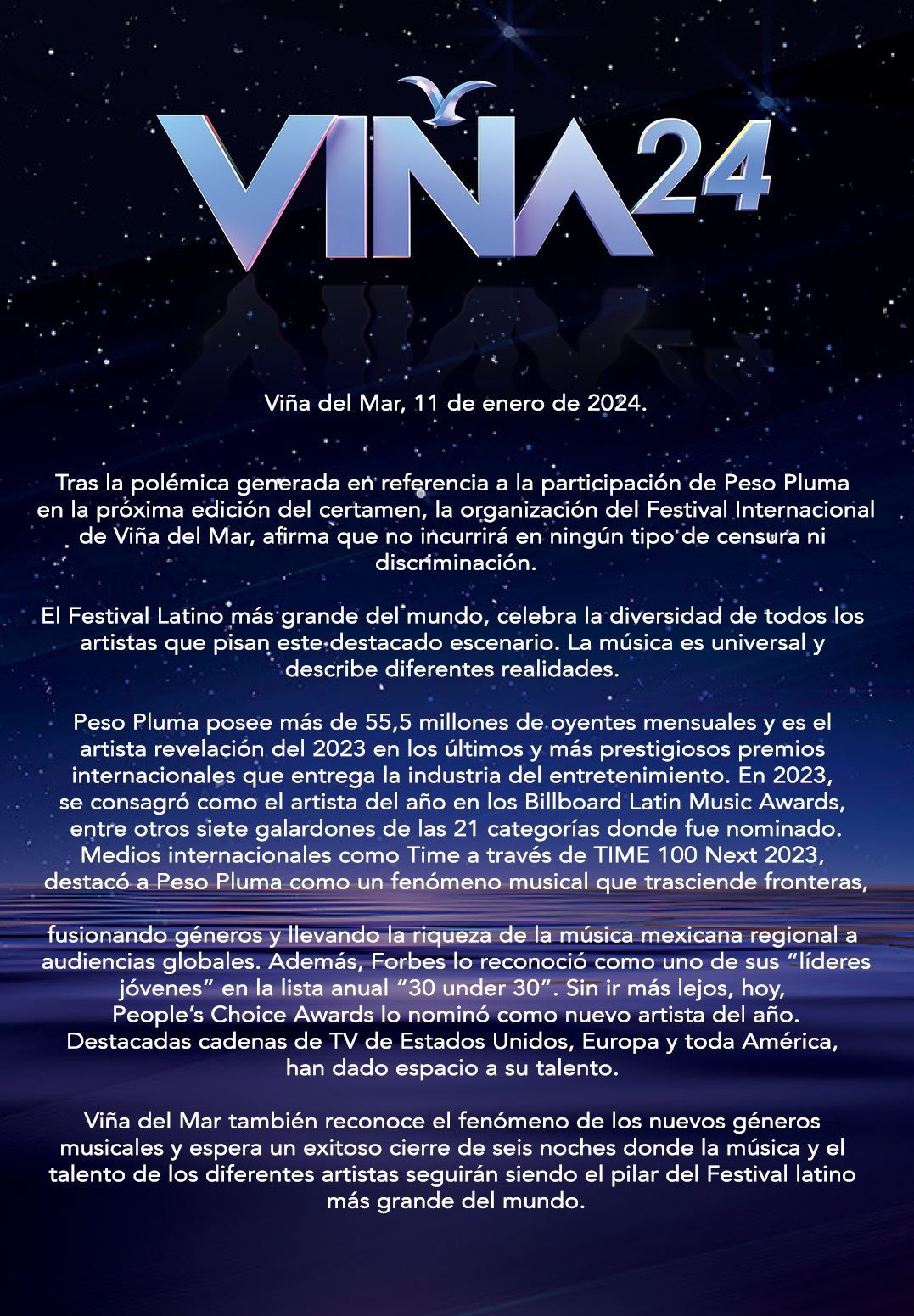 «Tras la polémica generada en referencia a la participación de Peso Pluma en la próxima edición del certamen, la organización afirma que no incurrirá en ningún tipo de censura ni discriminación», dijo un comunicado oficial.