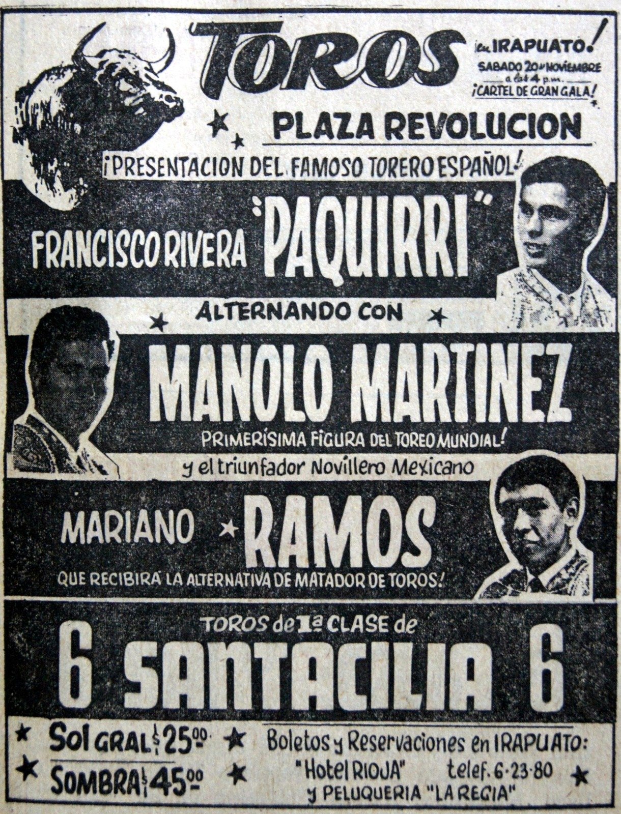 En su segunda actuación, el 20 de noviembre de 1946, compartió cartel con Lorenzo Garza y Luciano Contreras, y regresó por última vez el 15 de febrero de 1947, con Jesús Solórzano y Luis Procuna. Ese mismo año, el toro Islero, de Miura, le quitó la vida en Linares, España.