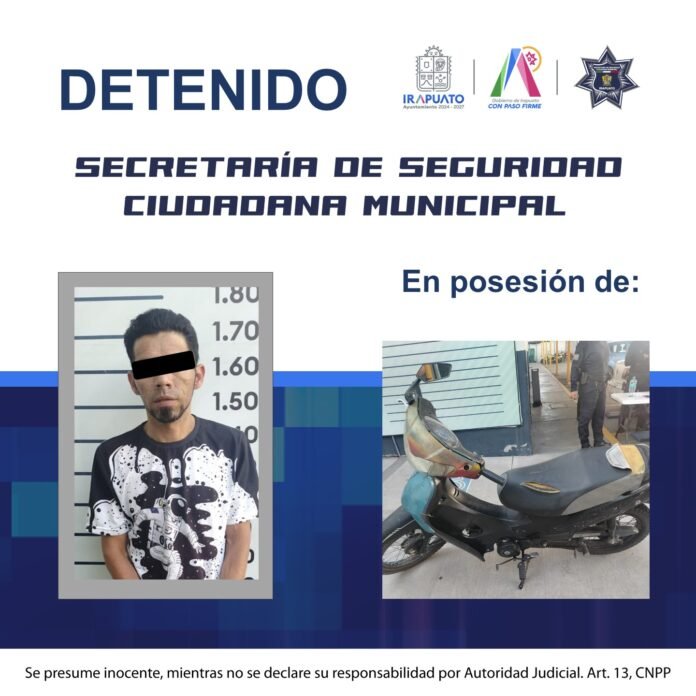 Irapuato, Gto., a 24 de septiembre de 2025.– Elementos de la Secretaría de Seguridad Ciudadana (SSC) de Irapuato lograron la detención de Iván Efraín “N”, de 37 años, en posesión de una motocicleta con reporte de robo vigente.