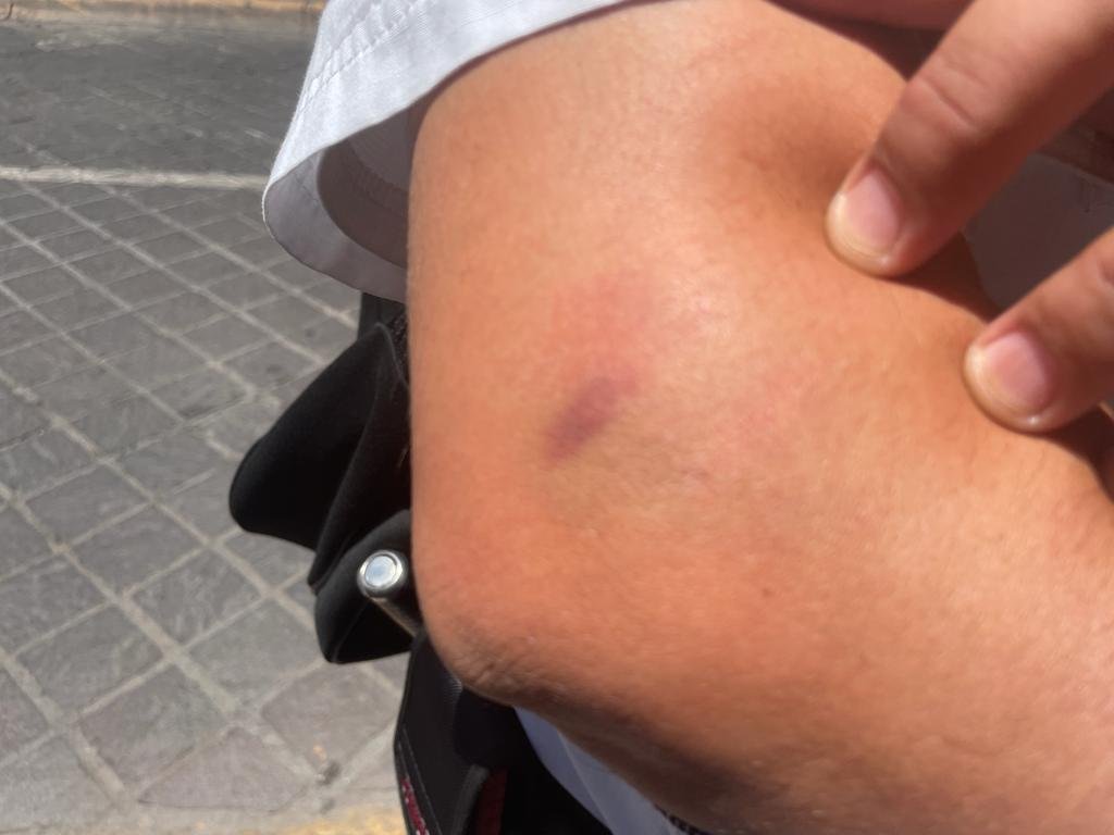 El elemento de vialidad, sufrió golpes en su cuerpo y muestra moretones de los cuales uno fue constatado por T Informa.