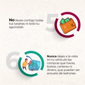 3.- Se recomienda acudir a cobrar el pago de aguinaldo en compañía de alguien de confianza, no portar todo el dinero en un solo lugar, distribúyelo en diferentes bolsas de tus prendas.