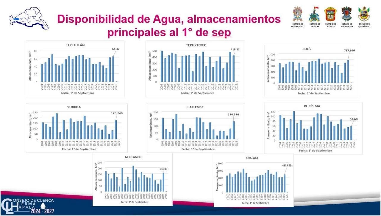 Los registros de almacenamiento en las presas Solís, Yuriria, Ignacio Allende y Purísima fueron comparados durante el periodo de 2004 al 1 de septiembre de 2025, usando la unidad de medida hectómetro cúbico (hm³), equivalente a un millón de metros cúbicos.