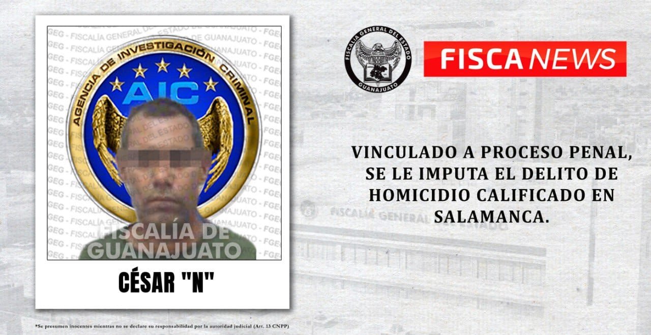 CÉSAR “N”, ha sido vinculado a proceso penal por homicidio calificado, luego de que la Fiscalía de Guanajuato aportó elementos de prueba, días después de que dicho sujeto perpetró un ataque con arma de fuego, en el interior de un domicilio de la colonia Rinconada San Javier, donde fueron asesinados un hombre y una mujer, el pasado 04 de junio en Salamanca.