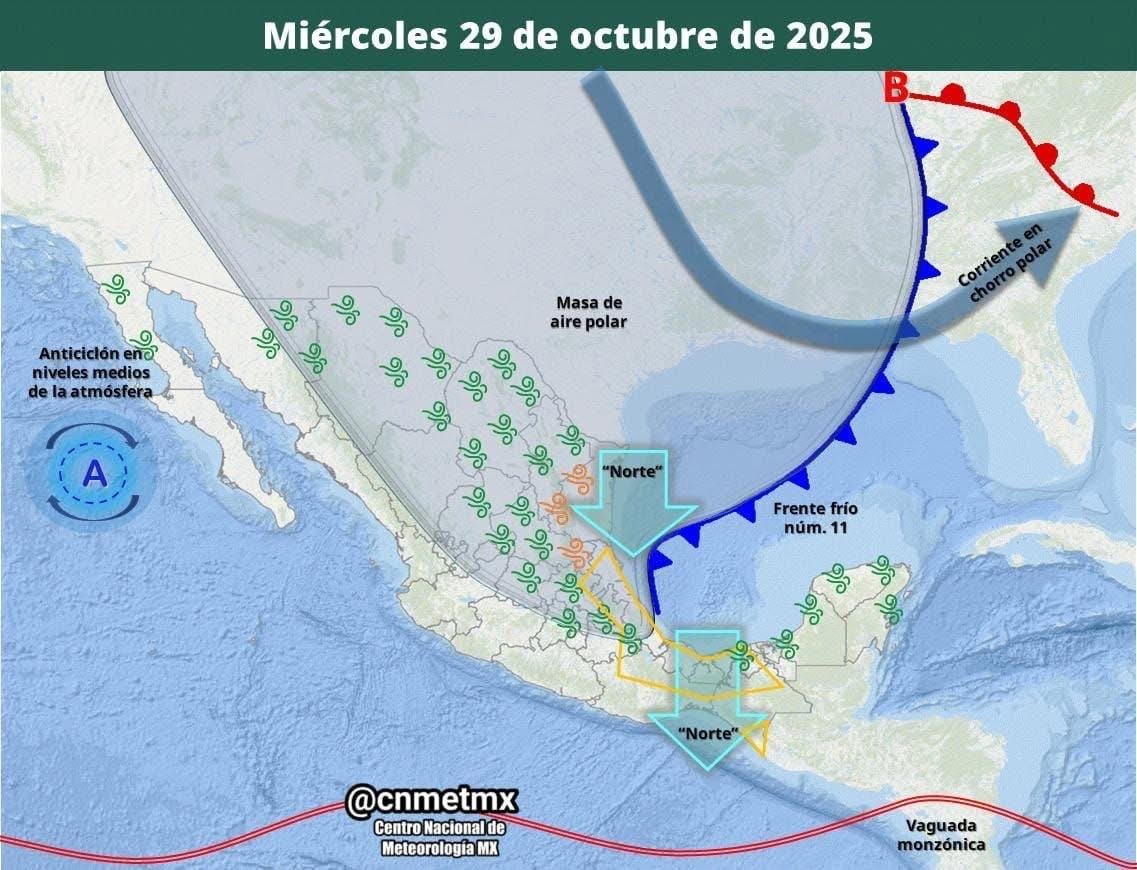 De acuerdo con el Centro Nacional de Meteorología, el frente frío se desplazará sobre la vertiente del Golfo de México, generando chubascos y lluvias fuertes a muy fuertes en estados del noreste, oriente y sureste del país.