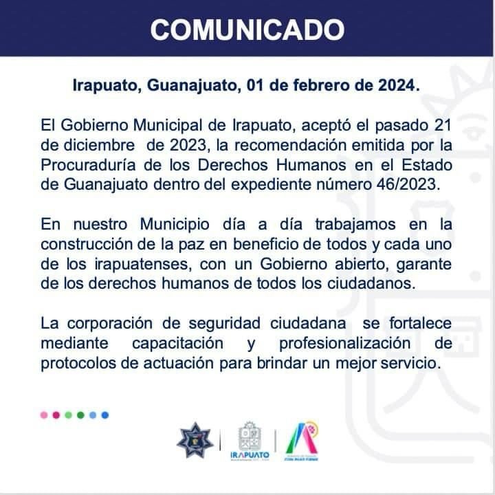 “El gobierno municipal de Irapuato aceptó el pasado 21 de diciembre de 2023 la recomendación emitida por la Procuraduría de los Derechos Humanos en el Estado de Guanajuato dentro del expediente número 46/2023. En nuestro municipio día a día trabajamos en la construcción de paz en beneficio de todos y cada uno de los irapuatenses con un gobierno abierto, garante de los derechos humanos de todos los ciudadanos”.