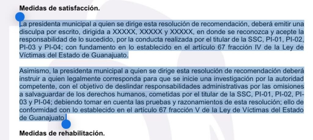 “La presidenta municipal a quien se dirige esta resolución de recomendación, deberá emitir una disculpa por escrito, dirigida a XXXXX, XXXXX y XXXXX, en donde se reconozca y acepte la responsabilidad de lo sucedido, por la conducta realizada por el titular de la SSC, PI-01, PI-02, PI-03 y PI-04; con fundamento en lo establecido en el artículo 67 fracción IV de la Ley de Víctimas del Estado de Guanajuato. Asimismo, la presidenta municipal a quien se dirige esta resolución de recomendación deberá instruir a quien legalmente corresponda para que se inicie una investigación por la autoridad competente, con el objetivo de deslindar responsabilidades administrativas por las omisiones a salvaguardar de los derechos humanos, cometidas por el titular de la SSC, PI-01, PI-02, PI-03 y PI-04; debiendo tomar en cuenta las pruebas y razonamientos de esta resolución; ello de conformidad con lo establecido en el artículo 67 fracción V de la Ley de Víctimas del Estado de Guanajuato”.