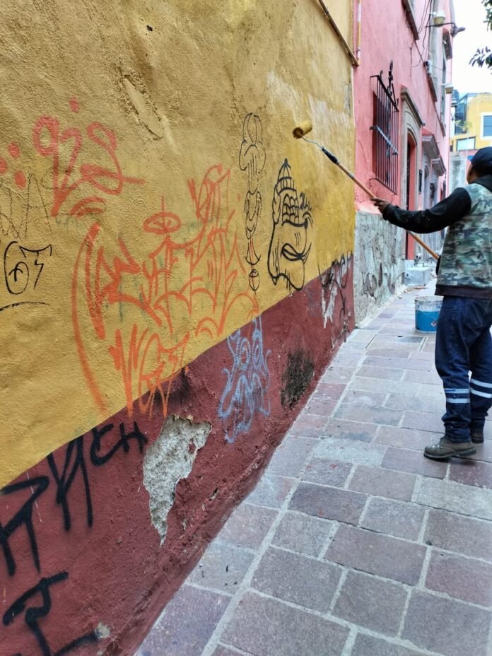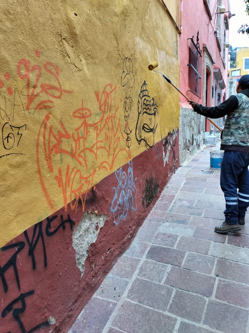 Guanajuato, Gto.; 6 de agosto de 2023.- El área de Mantenimiento del Gobierno Municipal realizó una jornada intensiva para borrar graffitis ilegales en cinco callejones de la zona centro y sumó más de 70 metros cuadrados de intervención en muros, mobiliario urbano y escalones.