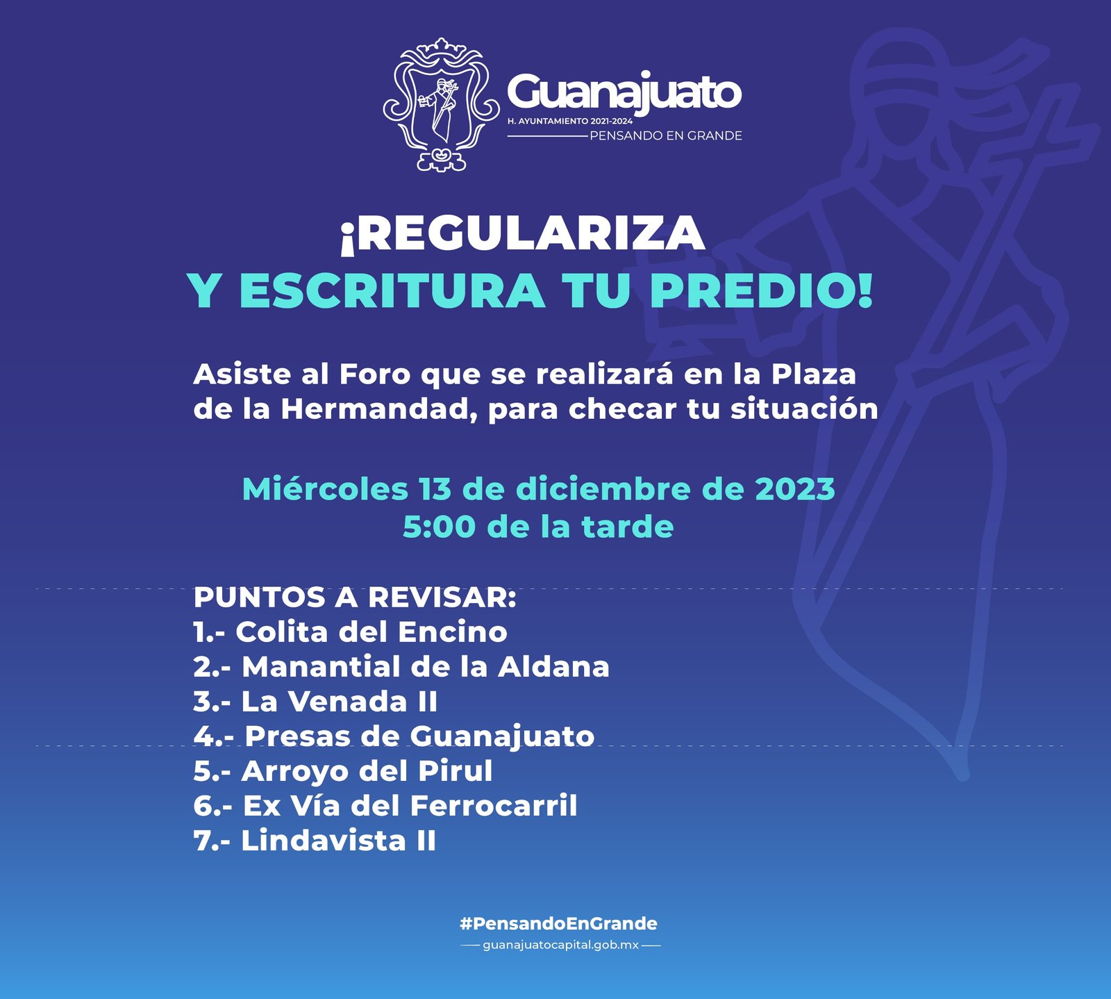 Guanajuato, Gto.; 12 de diciembre de 2023.- Este miércoles 13 de diciembre, el Ayuntamiento de Guanajuato Capital realizará un foro público para revisar los avances del proceso de regularización de predios en siete zonas de la ciudad.