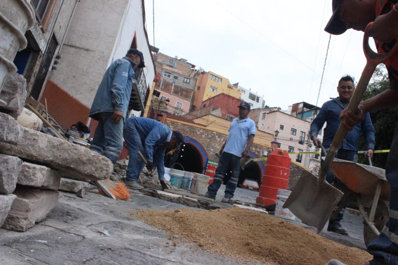 Guanajuato, Gto.; 18 de enero de 2024.- El programa de Bacheo 2024 del Gobierno Municipal arrancó con acciones de reparación en el centro histórico de Guanajuato Capital.