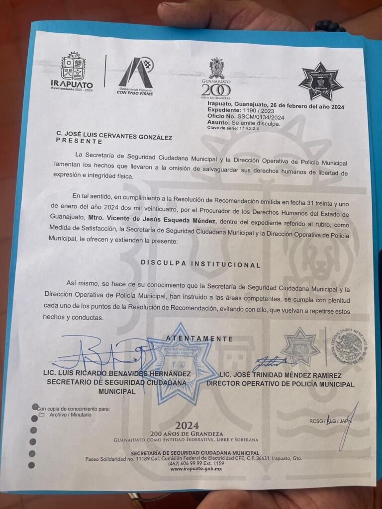 Después de la recomendación que llevó a cabo la Procuraduría de los Derechos Humanos del Estado de Guanajuato (Prodheg), donde destacaba que las autoridades debían pedirle disculpas al fotoperiodista José Luis Cervantes, tras ser agredido el año anterior por elementos de seguridad.