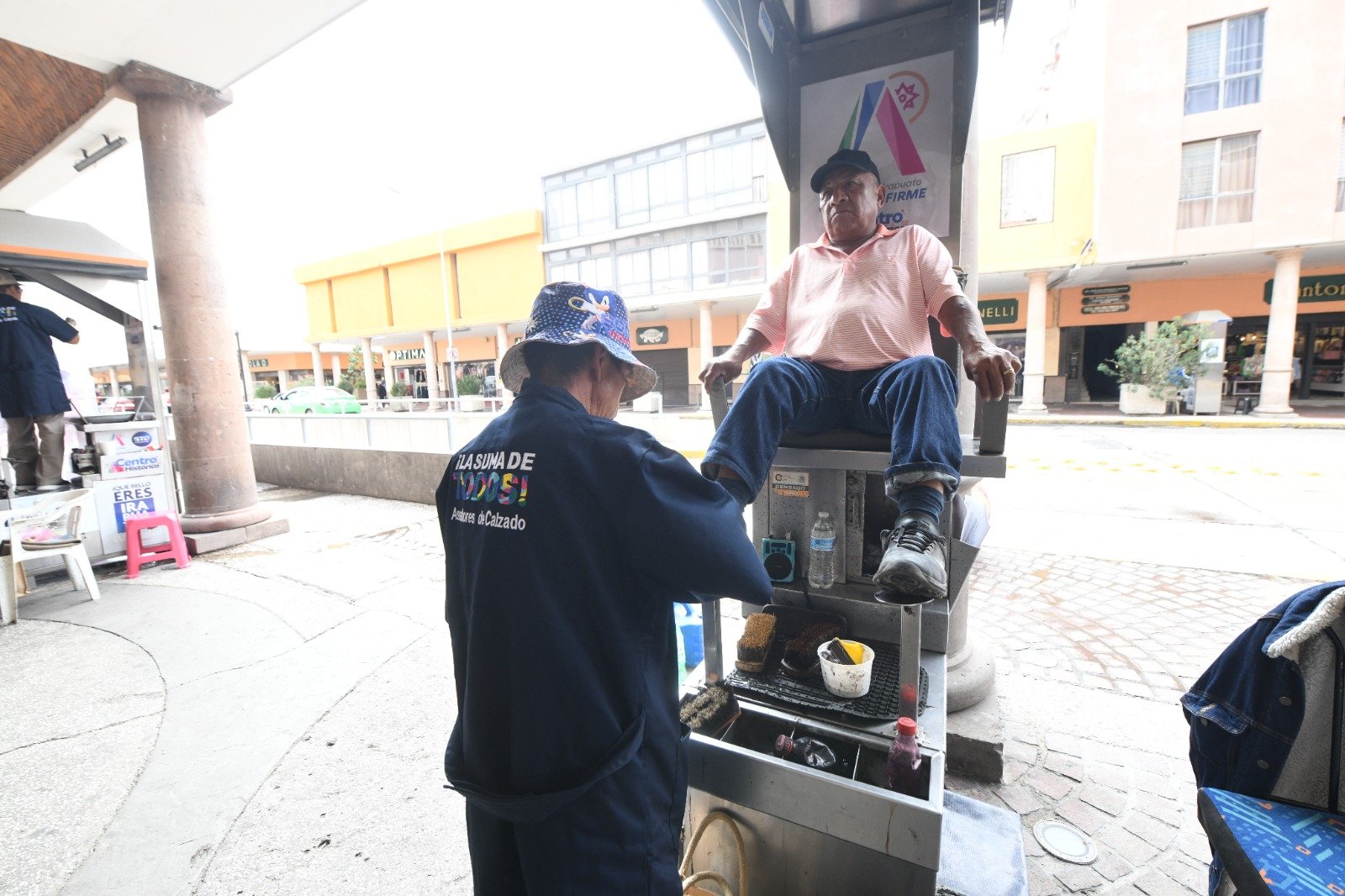 David Alejandro Pérez Soto, se dedica a la limpieza del calzado en el Centro Histórico y agradeció a la presidenta municipal, Lorena Alfaro García, la entrega y dedicación para ordenar el comercio y brindar más y mejores oportunidades a todos.