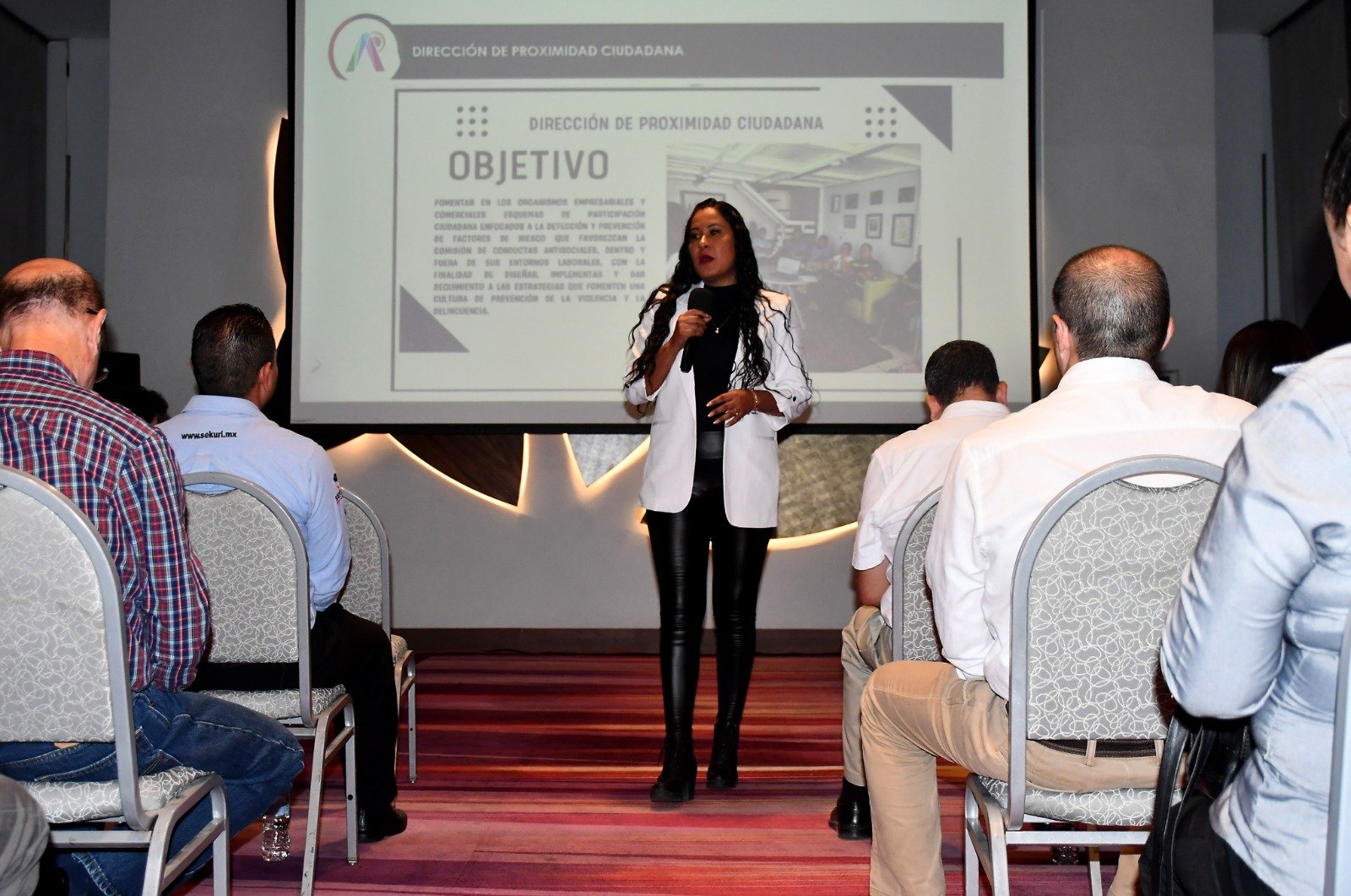 Rosario Gutiérrez Sandoval, directora de Proximidad Ciudadana, explicó a las y los asistentes que se apoya a las empresas con capacitaciones en temas de prevención de la violencia y la delincuencia, uso y recomendaciones del botón de enlace ciudadano y campañas preventivas para prevenir delitos como extorsiones y robos.