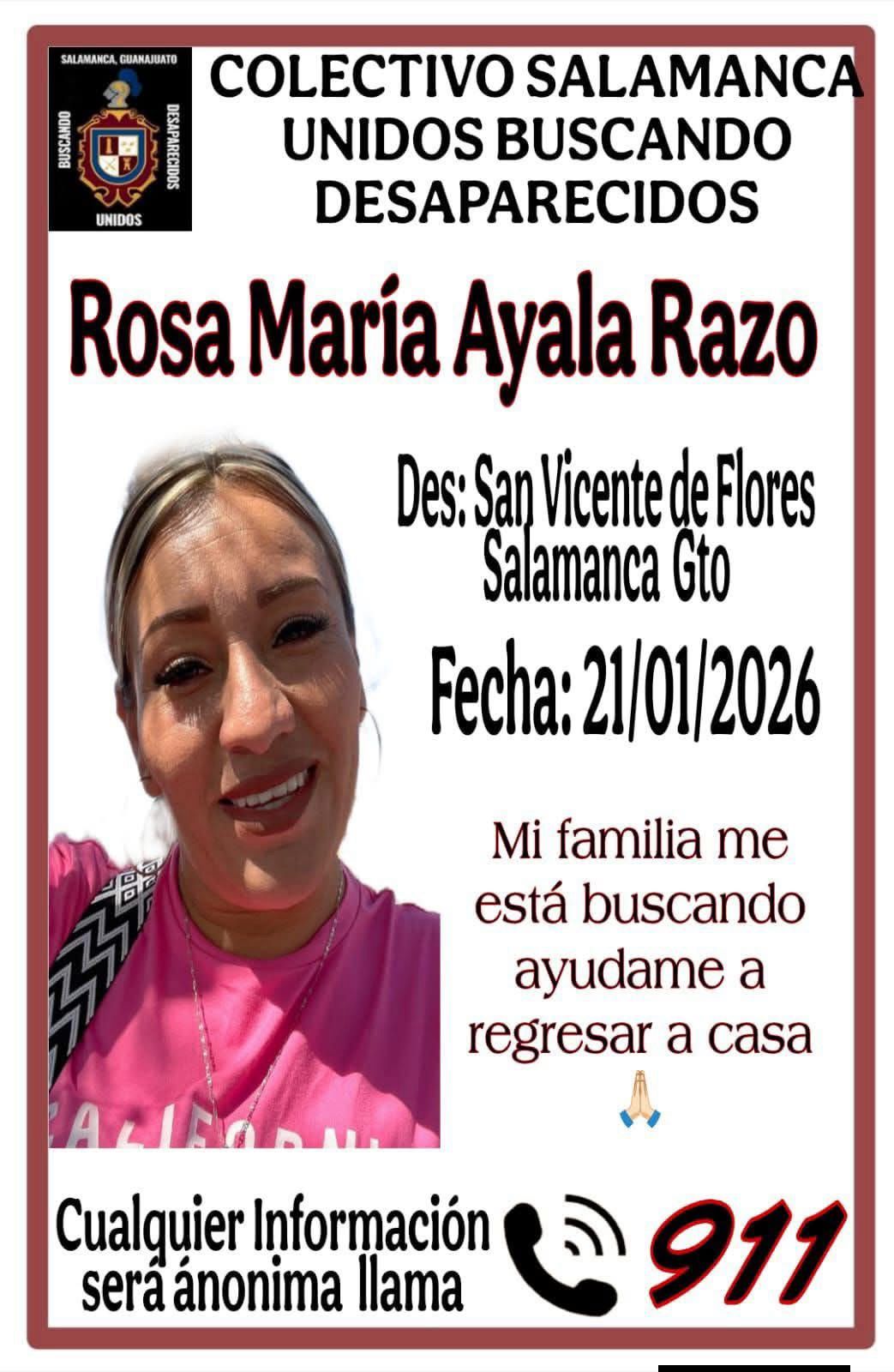 El colectivo de búsqueda de desaparecidos Salamanca Unidos buscando desaparecidos, a través de una de las buscadoras, pidió la colaboración ciudadana para localizar a Rosa María Ayala Razo, quien desapareció el día 21 de enero de 2026 y se le vio por última vez en San Vicente de Flores.