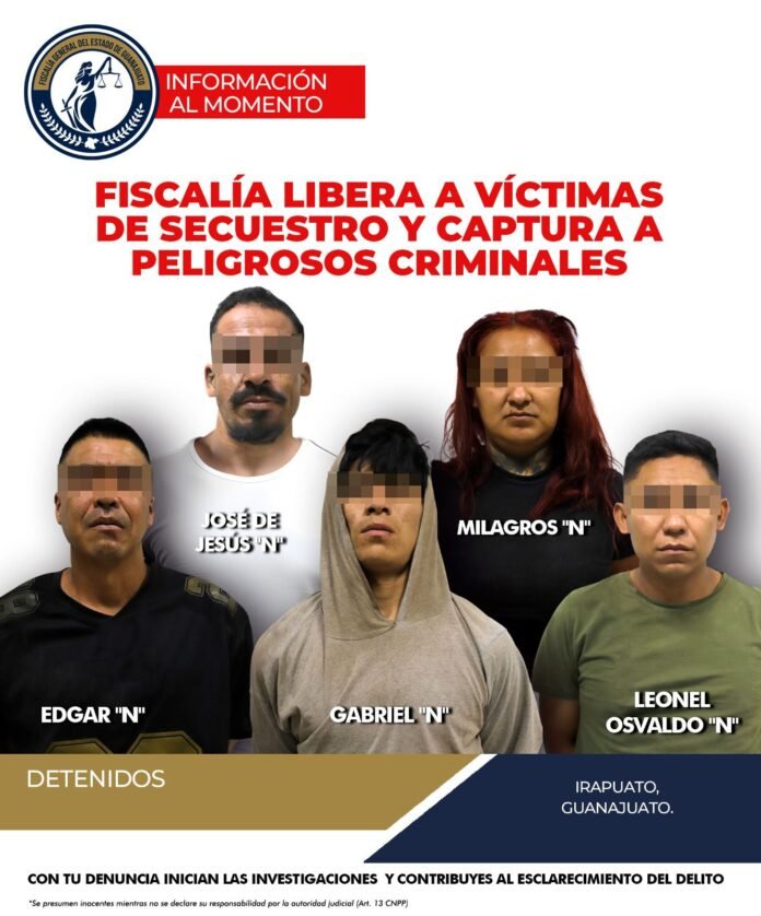 Irapuato, Gto.-, En una operación conjunta entre la Fiscalía General del Estado de Guanajuato y fuerzas de seguridad estatales y federales, se logró el rescate de dos personas secuestradas, entre ellas una menor de 14 años identificada como Luna Carolina, en el municipio de Irapuato. Durante el operativo, cinco presuntos integrantes de una célula delictiva fueron detenidos, y se aseguraron armas, drogas y equipo táctico.