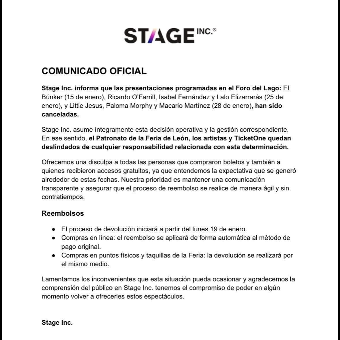Stage Inc ofreció una disculpa a las personas que adquirieron boletos y agradeció el respaldo del Patronato de la Feria de León 2026 durante el proceso de cancelación, sin detallar los motivos que llevaron a tomar esta decisión.