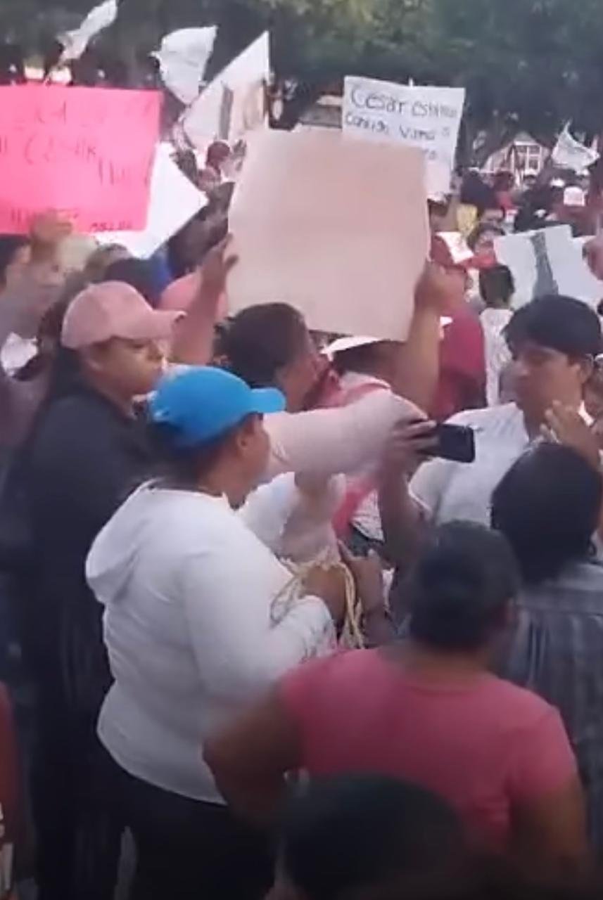 En un video,se ve como me están agrediendo, aventandome y poniéndome el altavoz cerca del celular ,las matracas en el oído,en la cara, y una señora llegó muy agresiva jalaneándome, además su gente de César y la Guardia Nacional, no dejaron que se le acercaran a él, porque ahí estaba Fernando el encargado del agua y cuando se le iba a acercar a César la GN no lo dejó, al ex delegado (don pipo) y don Carmelo la gente acarreada no los dejo acercar”.