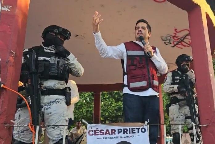 Salamanca.- Habitantes de la comunidad de Valtierrilla y Morenistas se confrontaron a jaloneos ante un candidato que busca su reelección a la alcaldía y que fue cuidado en el mismo estrado por elementos de la guardia nacional armados con la asistencia de funcionarios de su administración en funciones.