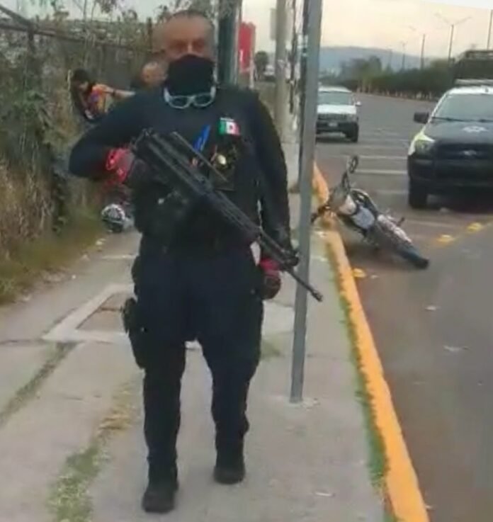 La patrulla de la policía se observa que no cuenta con placa de circulación delantera para su identificación oficial, y la motocicleta se ve tirada sobre su costado izquierdo en el concreto asfalto del bulevar Valle de Santiago.