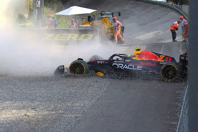 A falta de 10 minutos del segundo entrenamiento libre que se disputó en Monza, Checo perdió el control a la salida de la parabólica, para generar una bandera roja.