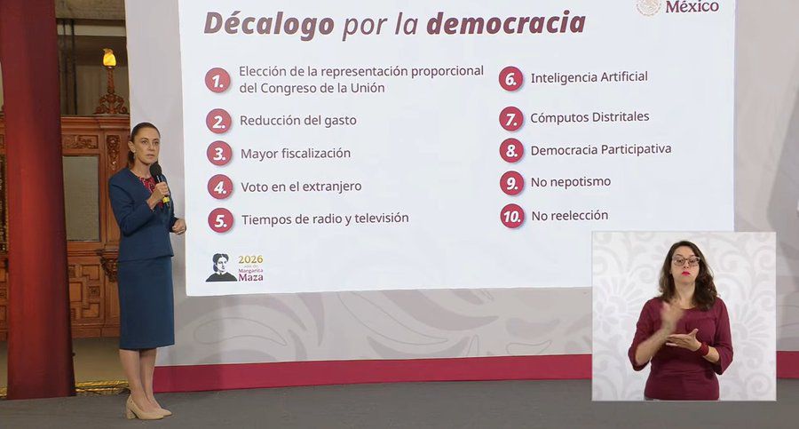Desde Palacio Nacional, la mandataria presentó el “Decálogo por la Democracia”, una síntesis de los 10 puntos centrales de la iniciativa que enviará al Congreso de la Unión. “Ya sería después”, respondió al ser cuestionada sobre una alternativa en caso de que la reforma no prospere.