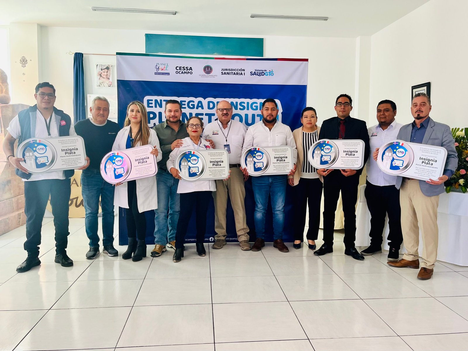 Ocampo. Guanajuato. 23 de abril del 2023.– El Sistema de Salud y la Jurisdicción Sanitaria I otorgaron 6 insignias de Planet Youth a las dependencias del Gobierno Municipal de Ocampo y unidades de salud.