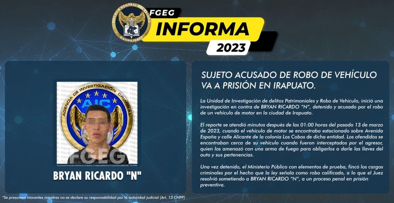 La Unidad de Investigación de delitos Patrimoniales y Robo de Vehículo, inició una investigación en contra de BRYAN RICARDO “N”, detenido y acusado por el robo de un vehículo de motor en la ciudad de Irapuato.