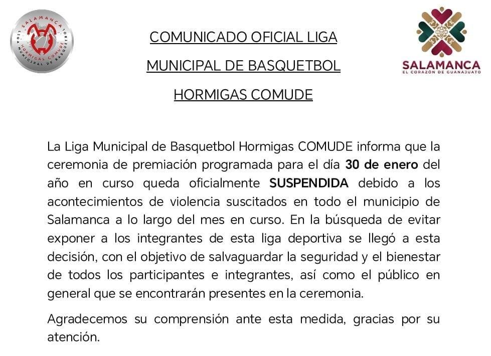 De acuerdo con la liga, la decisión se tomó “debido a los acontecimientos de violencia suscitados en todo el municipio de Salamanca a lo largo del mes en curso. En la búsqueda de evitar exponer a los integrantes de esta liga deportiva, se llegó a esta decisión con el objetivo de salvaguardar la seguridad y el bienestar de todos los participantes e integrantes, así como del público en general que estaría presente en la ceremonia”.