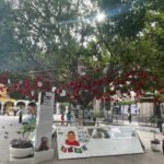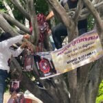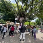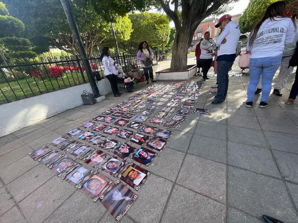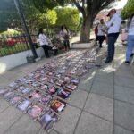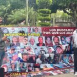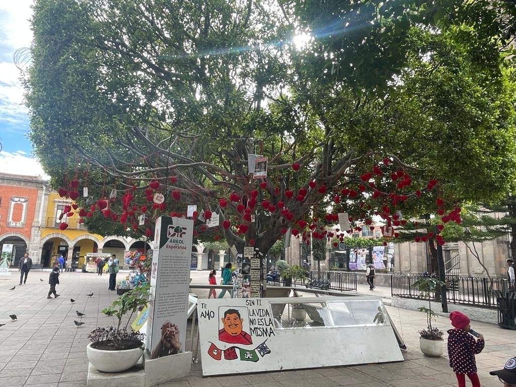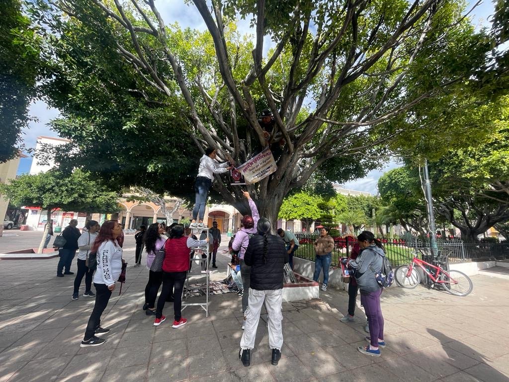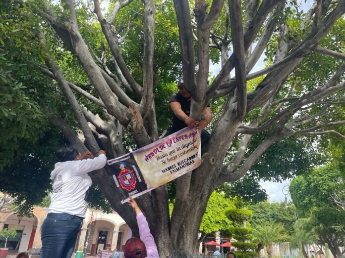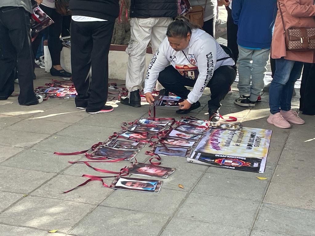 Luego, las mujeres (en su mayoría), colocaron en un árbol ubicad en el jardín principal, las fotografías y mantas que presentan las fotos de quienes no han sido localizados y continúan como desaparecidos.