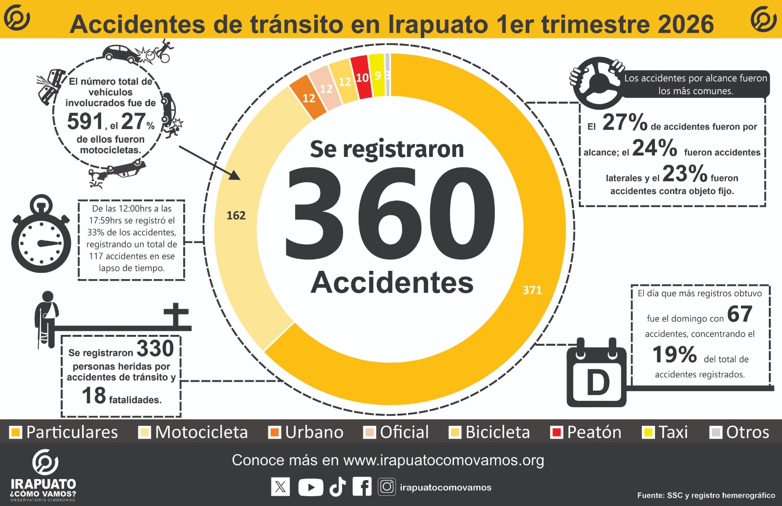 En Irapuato, la estadística es contundente: cada seis horas ocurre un accidente de tránsito. Así lo revela el reporte del Observatorio Ciudadano Irapuato ¿Cómo vamos?, que documenta 360 percances y 18 personas fallecidas durante el primer trimestre de 2026.