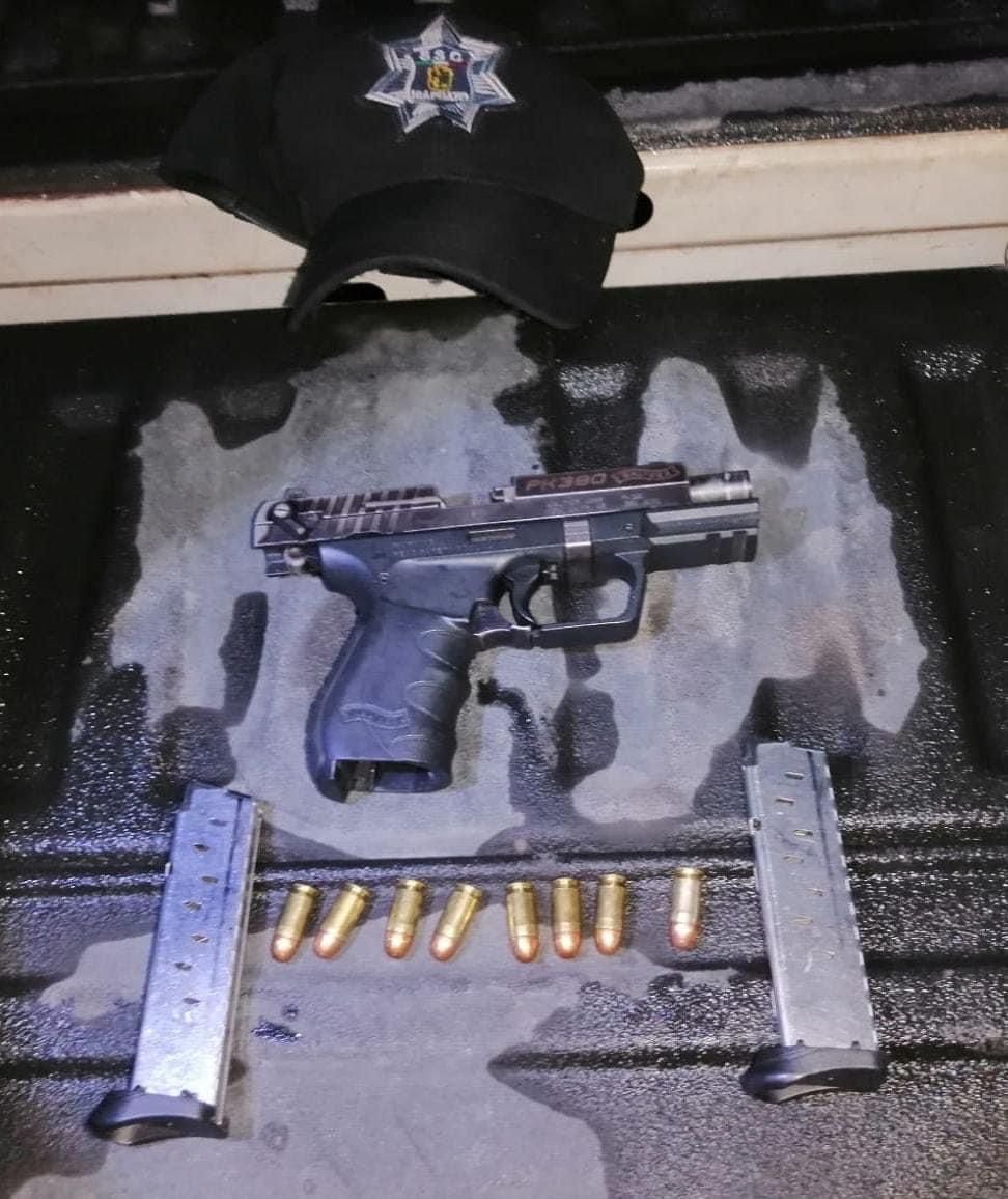 Al arribar a la calle Jiquilpan, los elementos localizaron la unidad reportada y un hombre al interior a quien le explicaron la situación, al realizarle una revisión preventiva le fue encontrado en la bolsa del pantalón un arma de fuego.