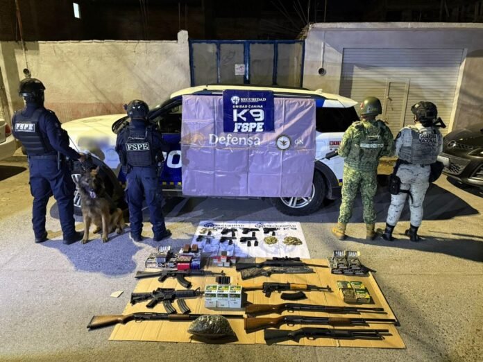 Tras la inspección, se aseguraron ocho armas largas y siete armas cortas, además de una carcasa de rifle, doce cargadores y municiones de distintos calibres. Asimismo, se localizó una bolsa con hierba verde y seca, con características similares a la marihuana, con un estimado de 380 dosis.