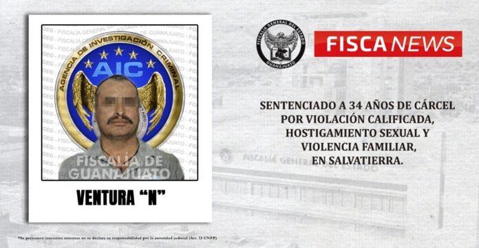 Salvatierra, Gto.- 27 de julio de 2023.- Un hombre llamado *VENTURA “N”*, fue sentenciado a 34 años de cárcel al ser encontrado culpable de los delitos de violación calificada, hostigamiento sexual y violencia familiar en contra de dos víctimas menores de edad, en la ciudad de Salvatierra.